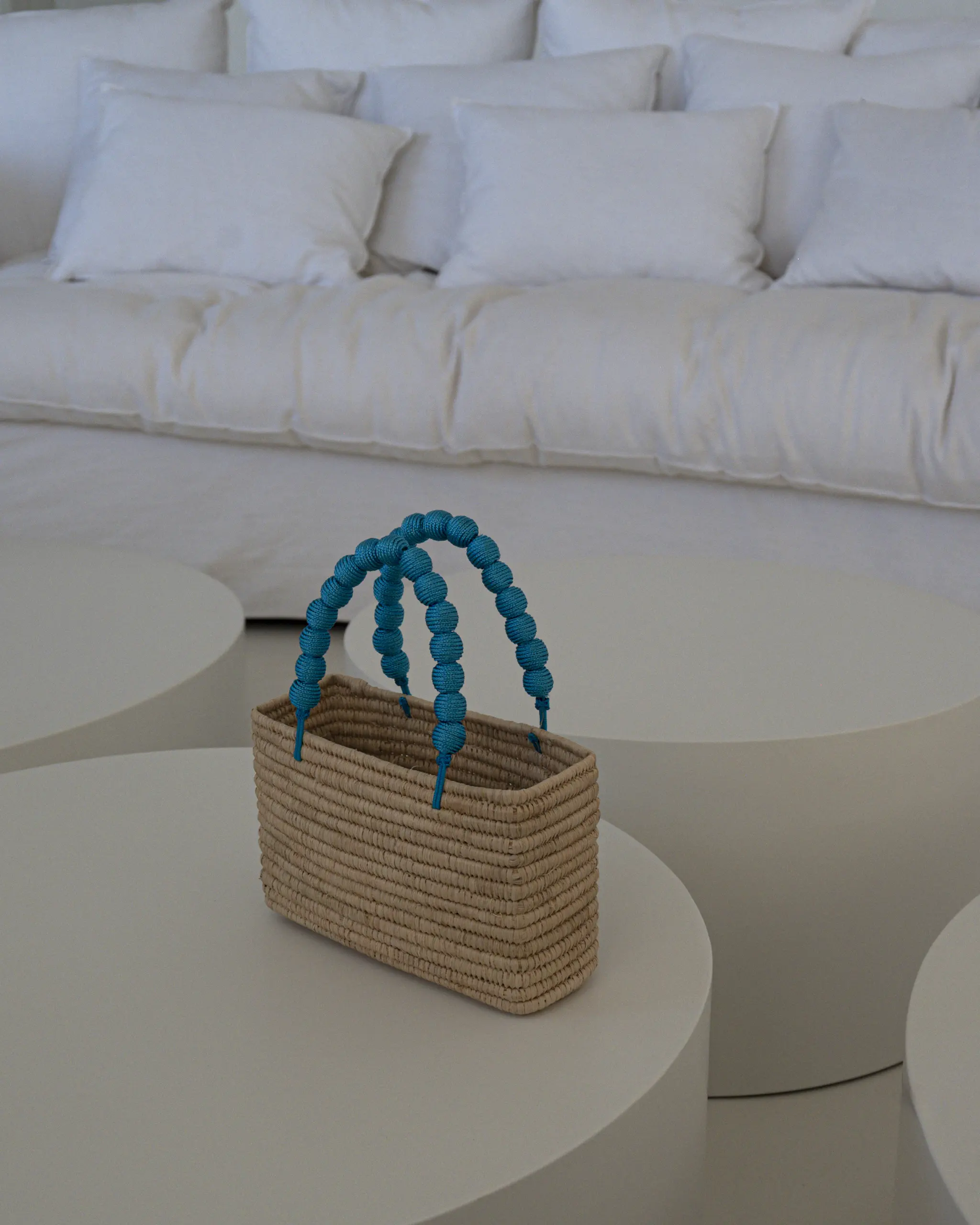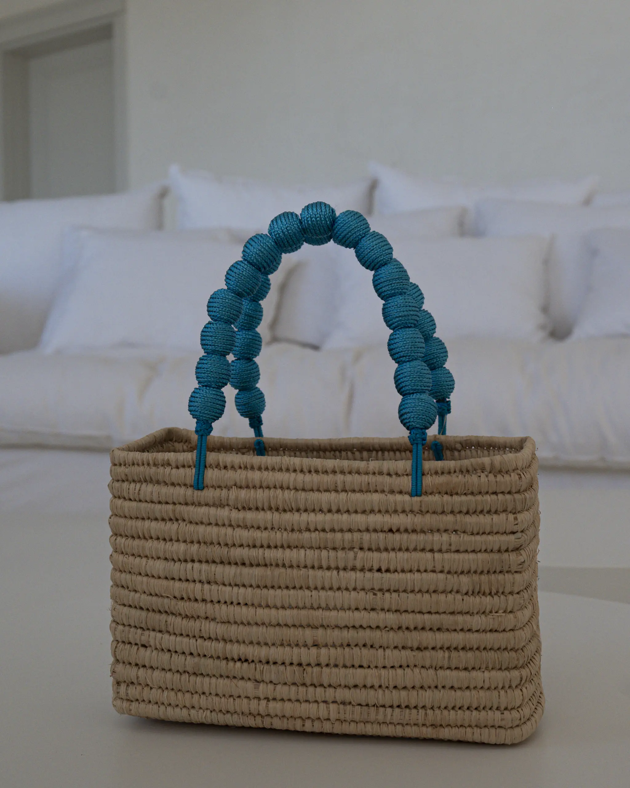 CARACTERÍSTICAS: Bolso de mano con asas decoradas con bolas forradas en hilo.