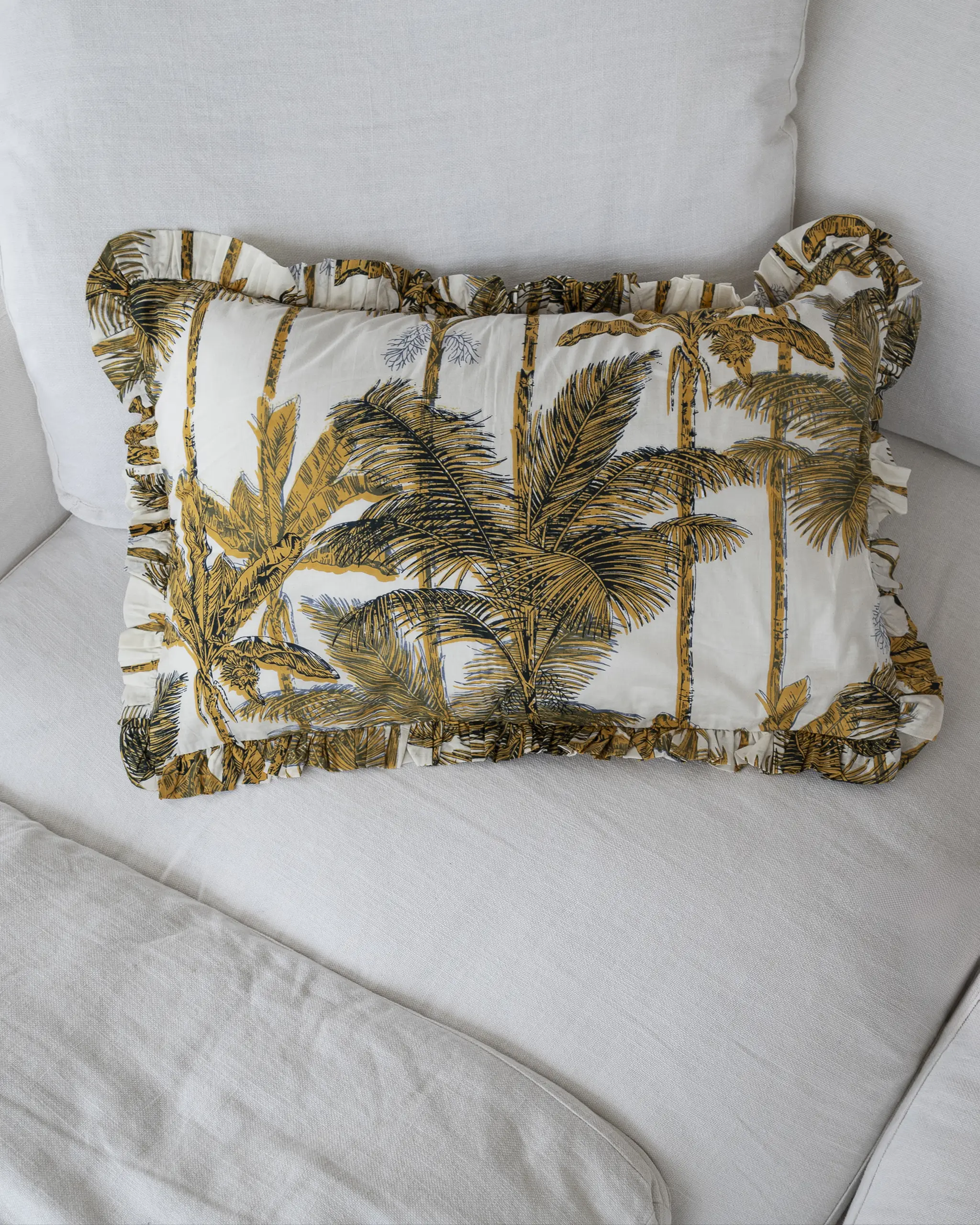 CARACTERÍSTICAS: Funda de cojín decorada con volantes. Disponible mantelería, neceseres y monederos con el mismo estampado.
