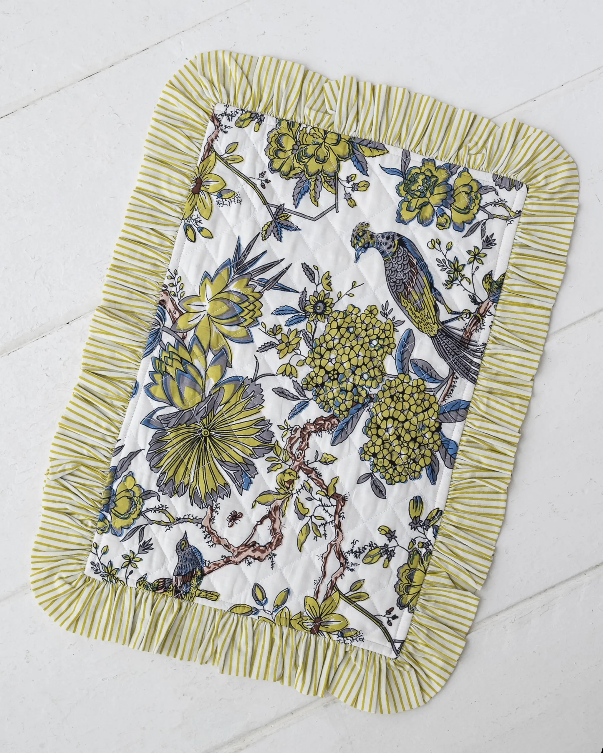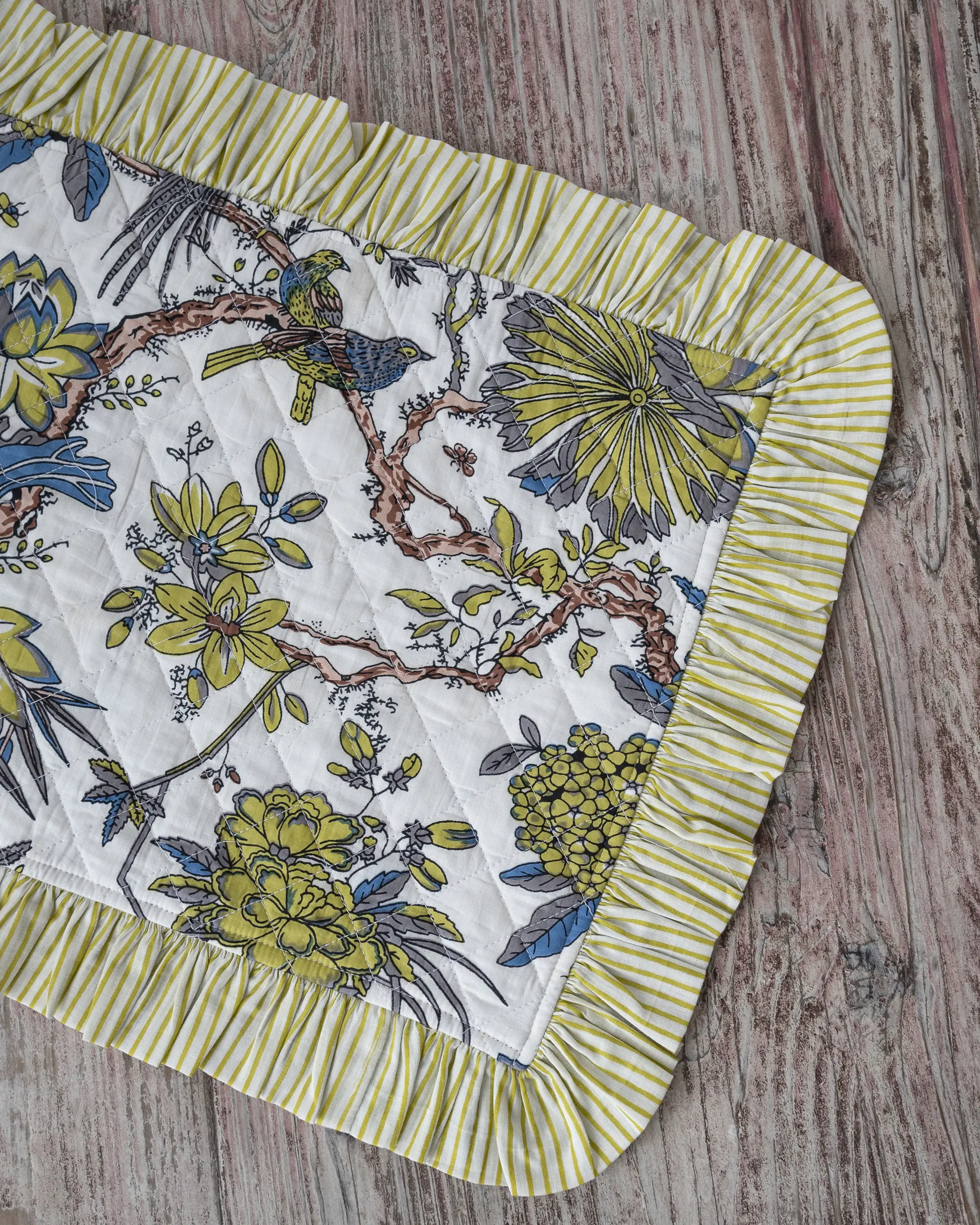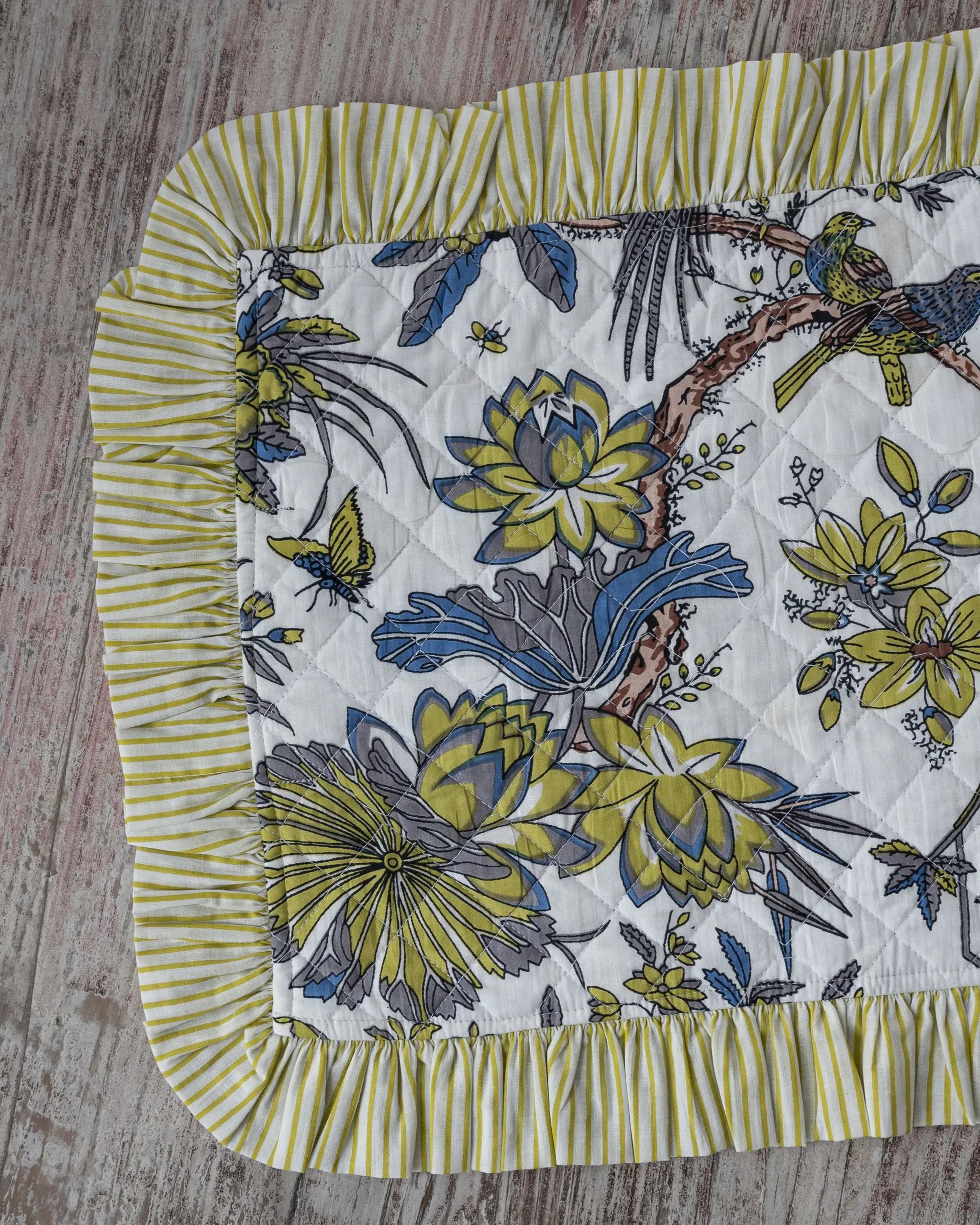 CARACTERÍSTICAS: Mantel individual acolchado de tejido estampado, decorado con volantes