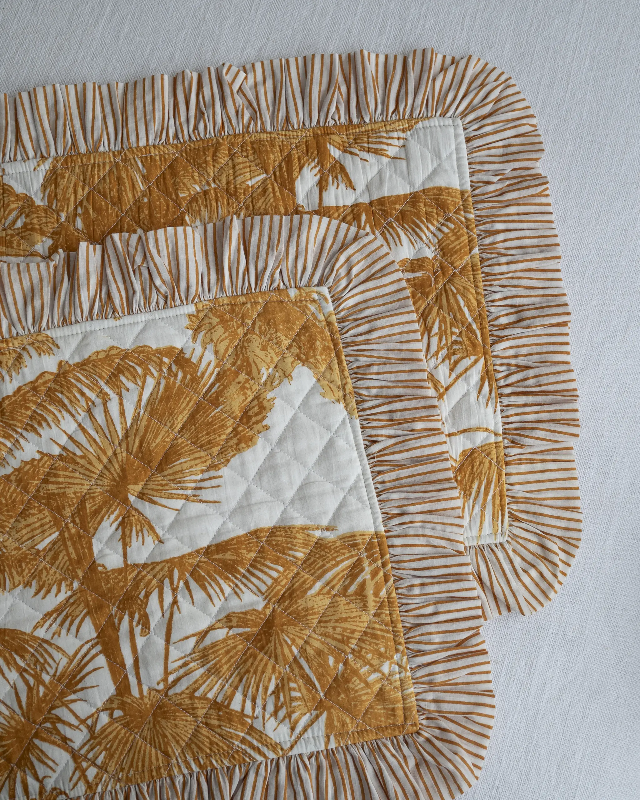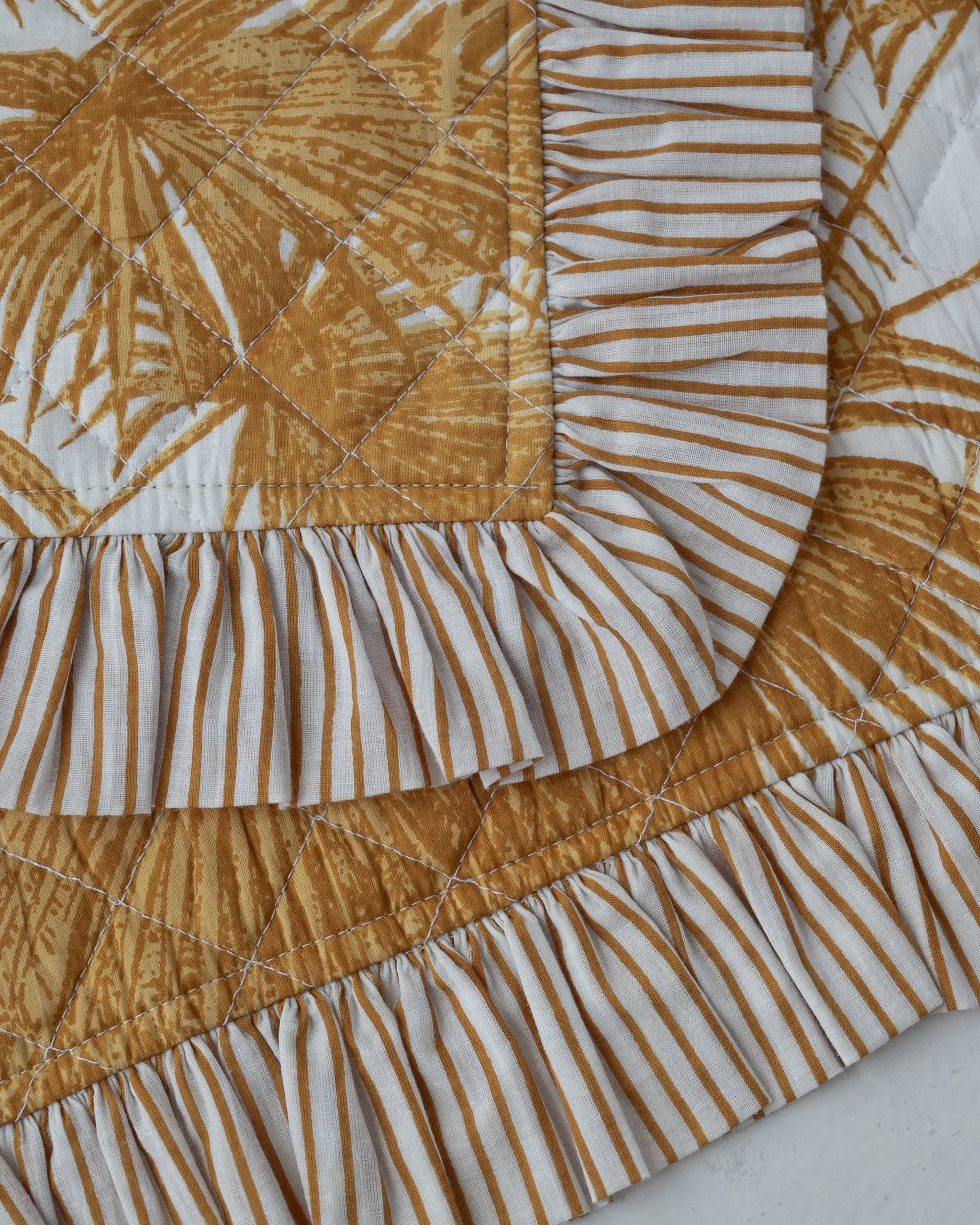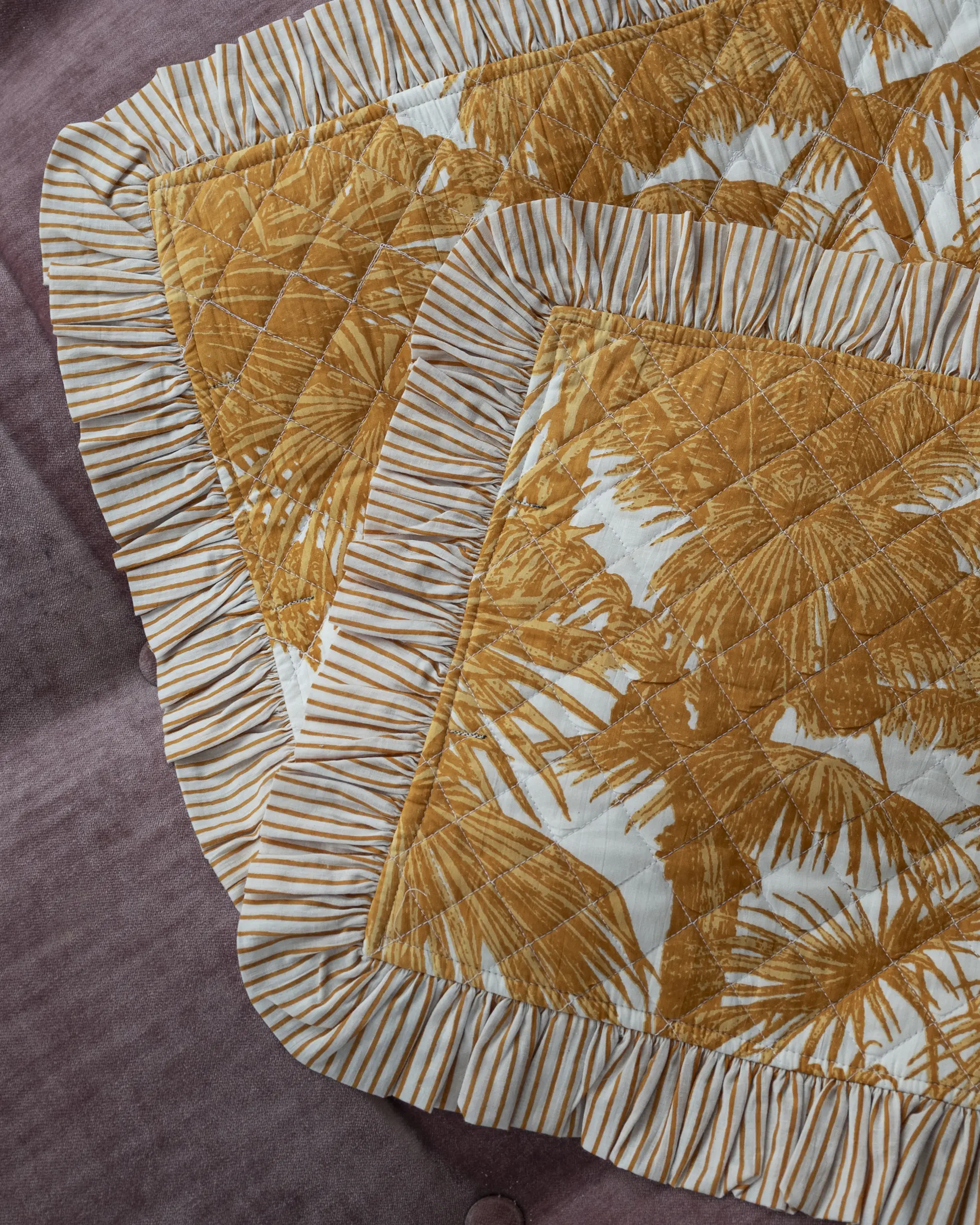 CARACTERÍSTICAS: Mantel individual acolchado de tejido estampado, decorado con volantes