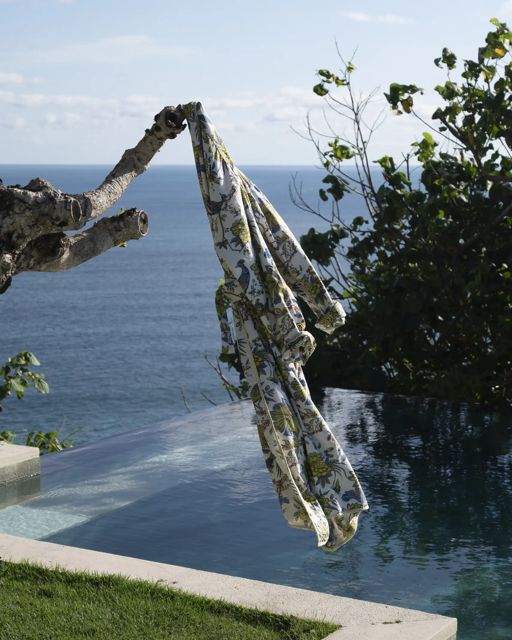 CARACTERÍSTICAS: Albornoz de manga larga, con cierre de cinturón del mismo tejido y bolsillos delanteros. Disponible mantelería, fundas de cojín, neceseres y monederos con el mismo estampado.