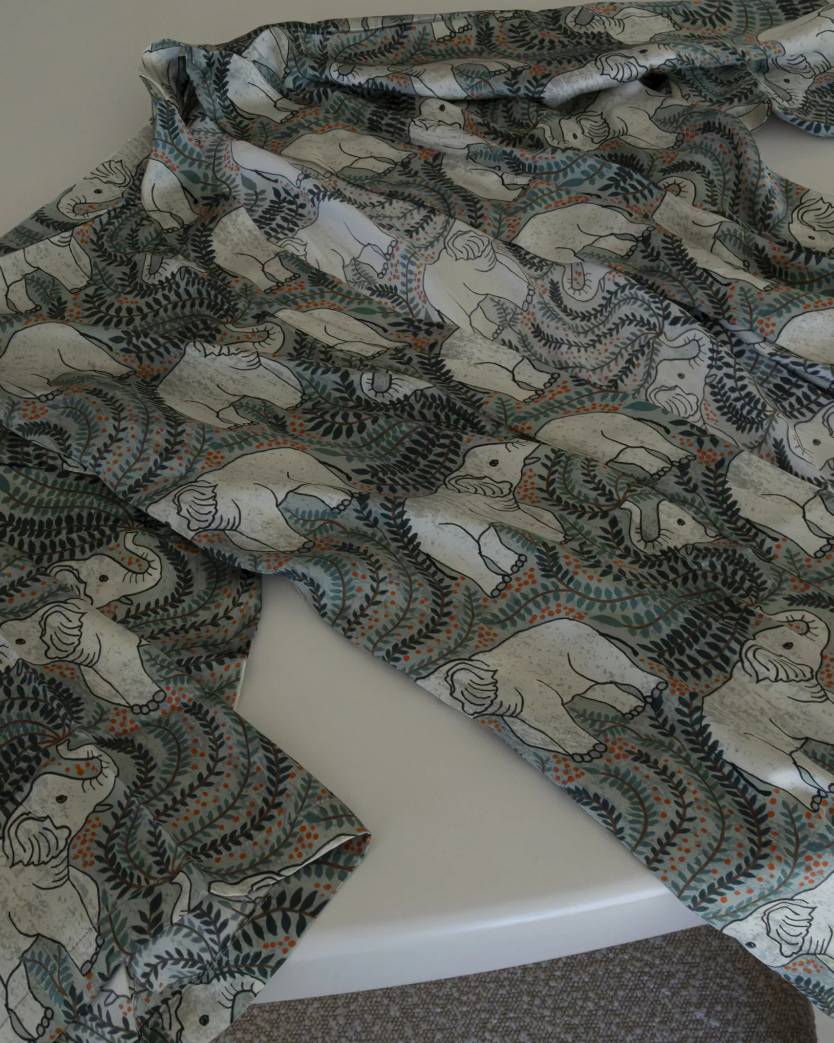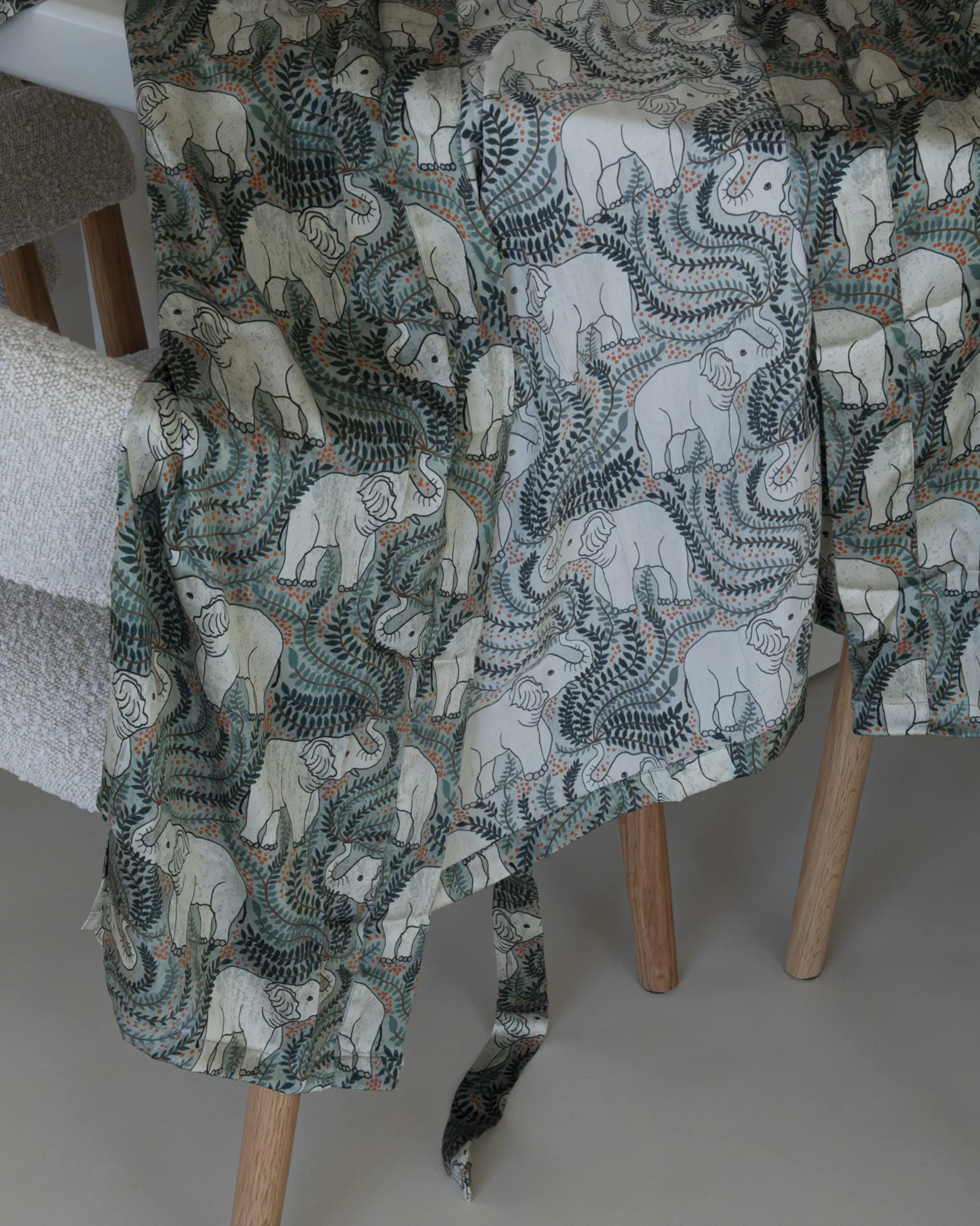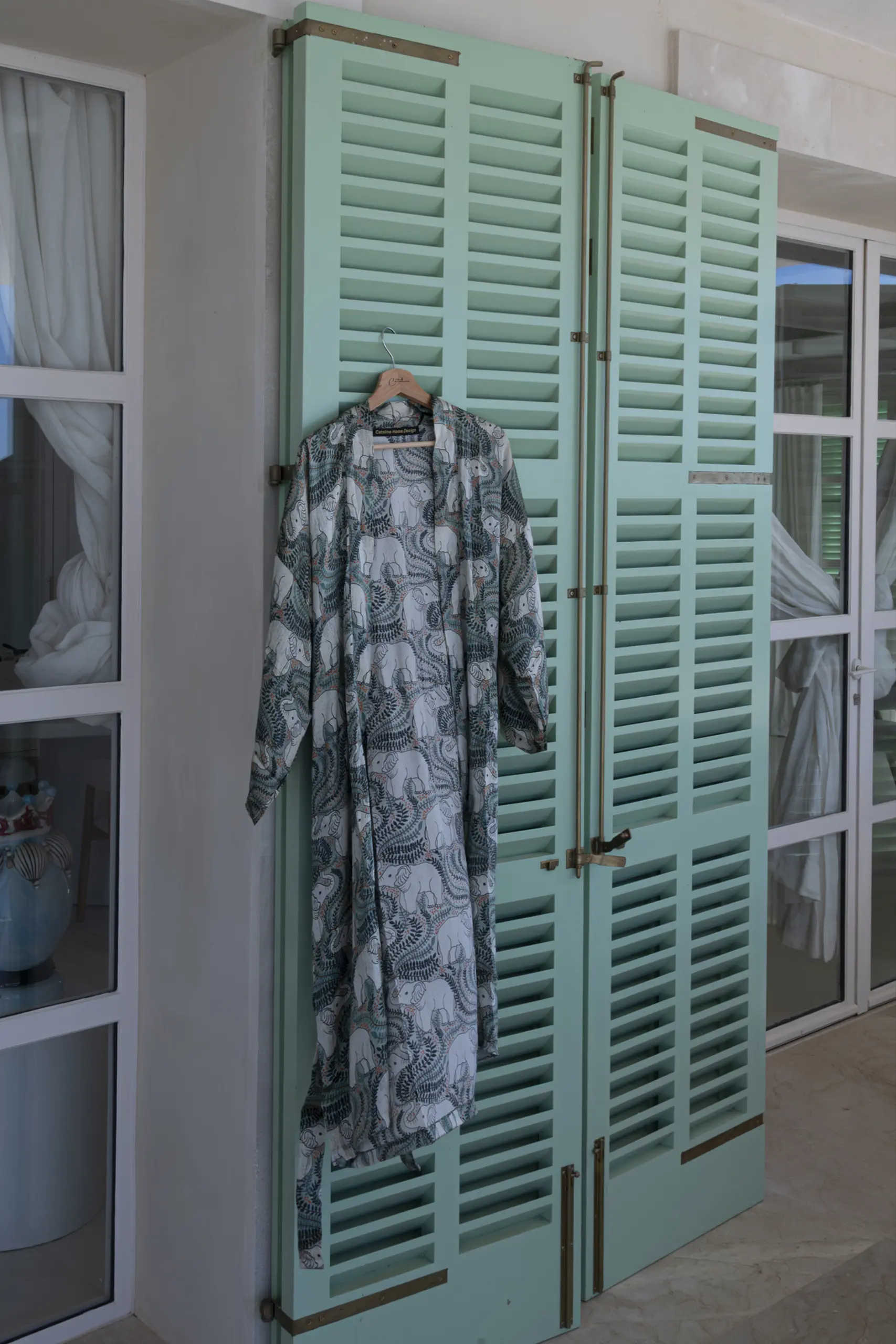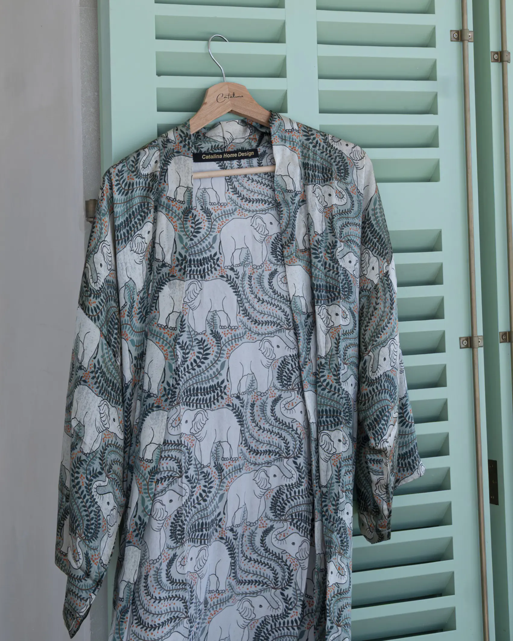 CARACTERÍSTICAS: Bata de manga larga, con cierre de cinturón del mismo tejido.