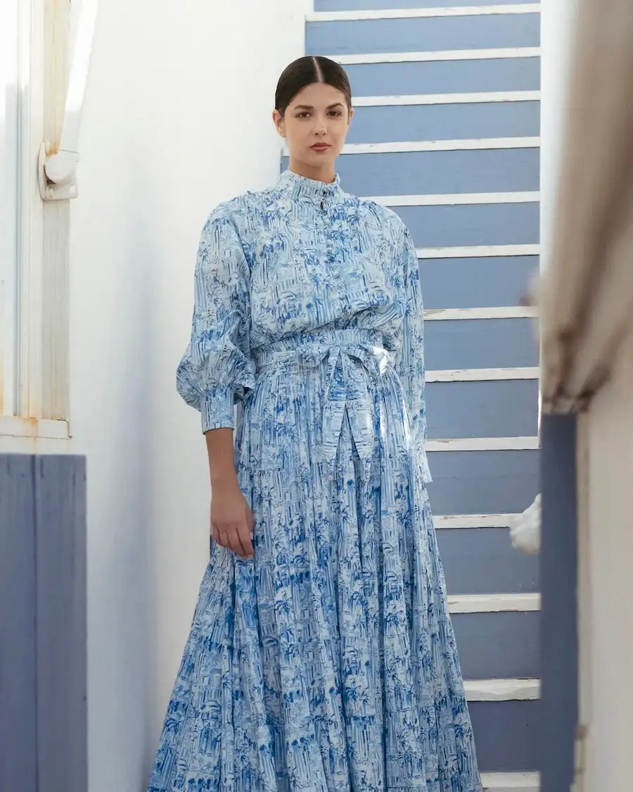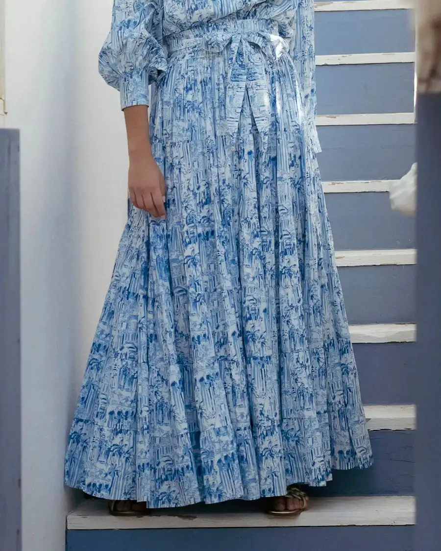 En armonía con el clima mediterráneo, Cassai Home presenta la Falda de Mujer con Estampado de Palmeras Azul, una pieza que reinterpreta la estética costera a través de un diseño en base de blancos cálidos que aportan luminosidad, combinados con un azul cielo suavizado que transmite equilibrio, frescura y naturalidad.