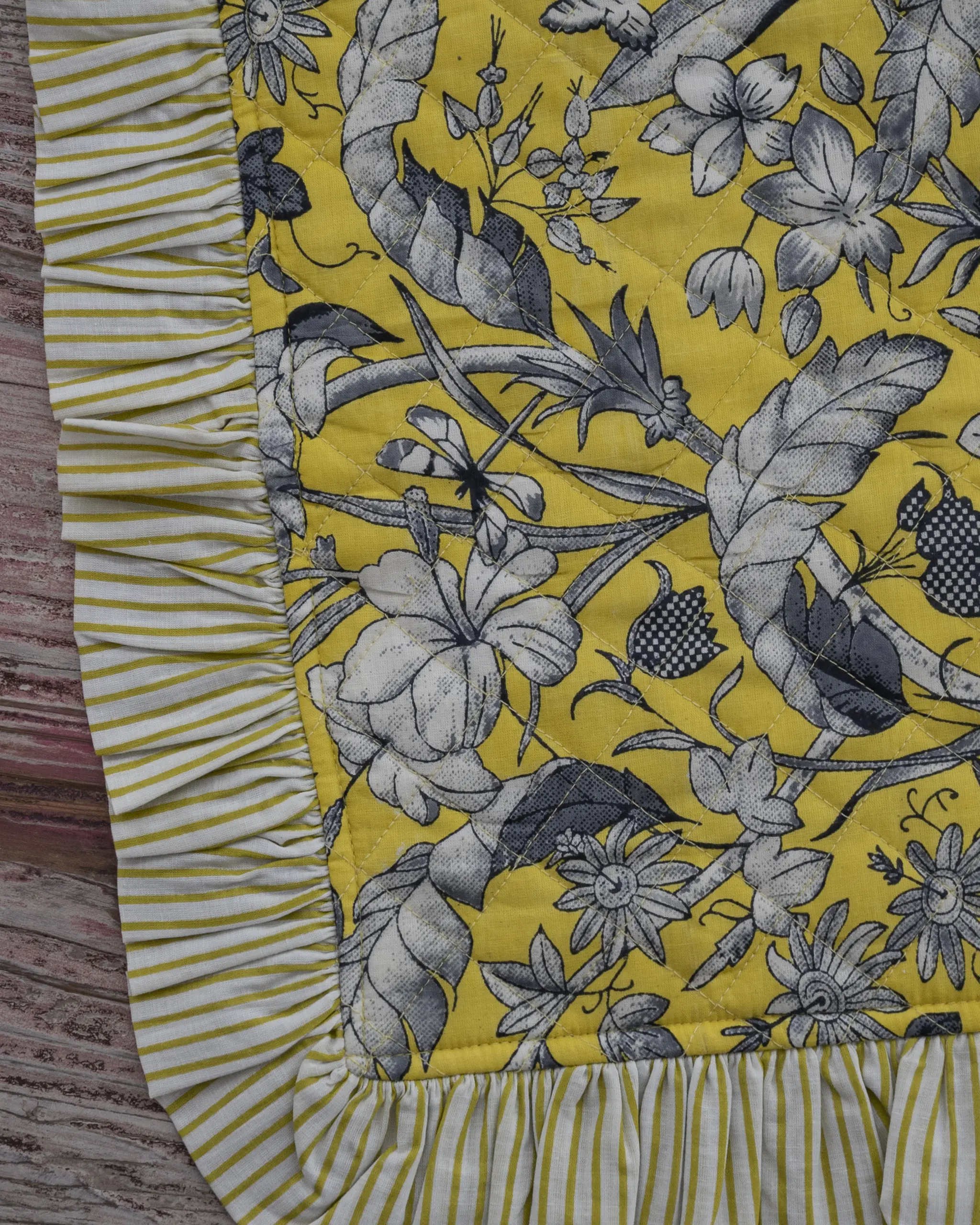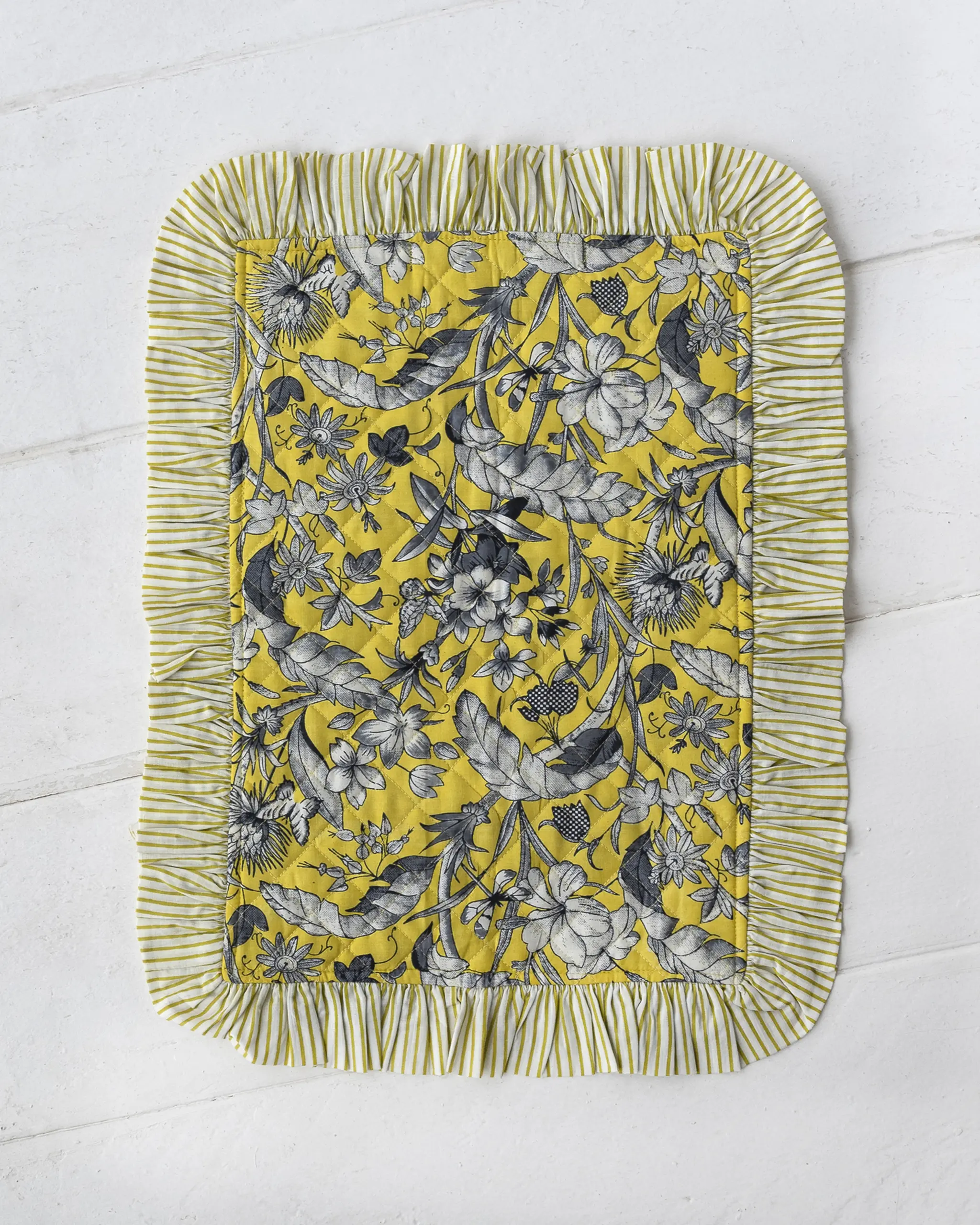 CARACTERÍSTICAS: Mantel individual acolchado de tejido estampado, decorado con volantes