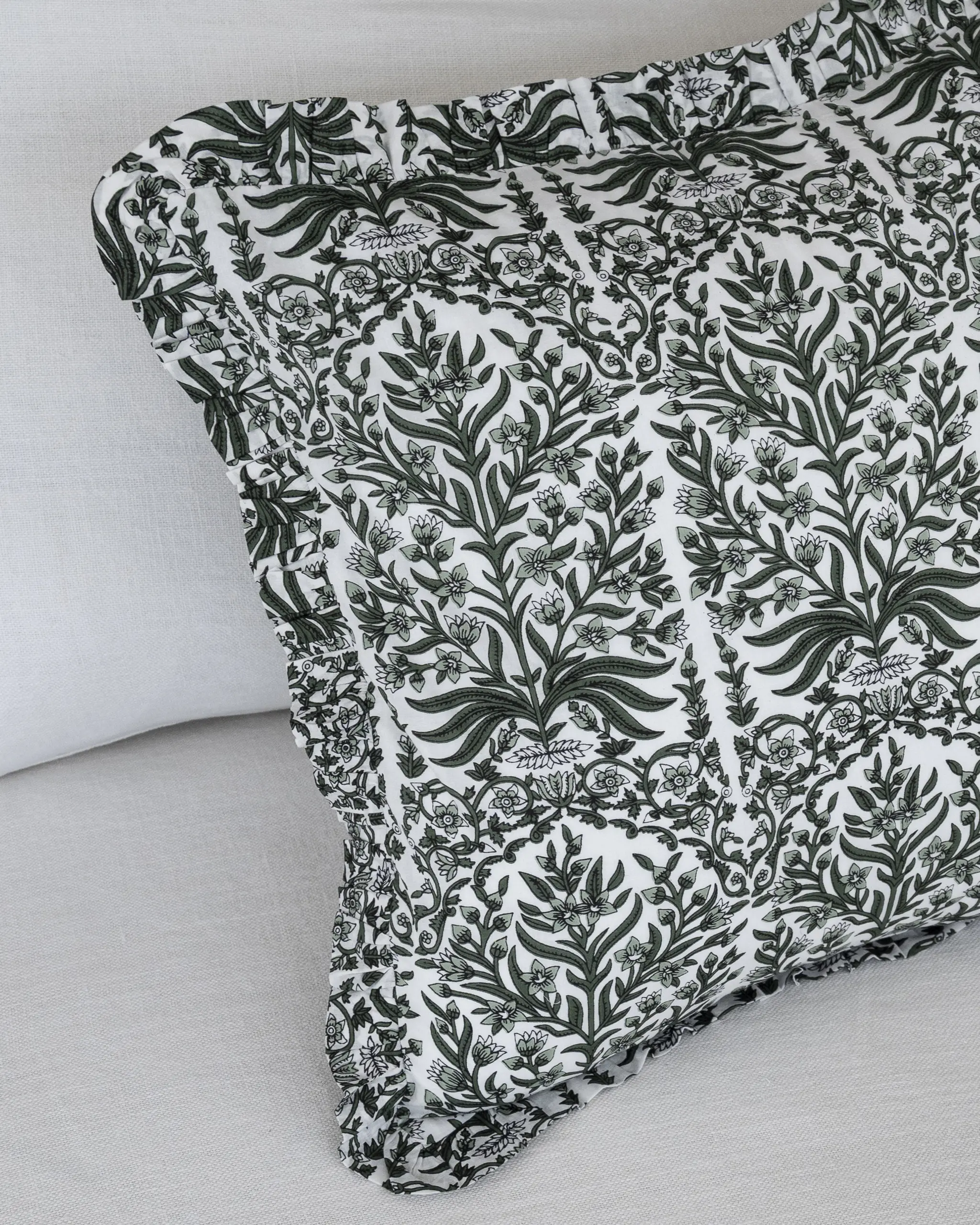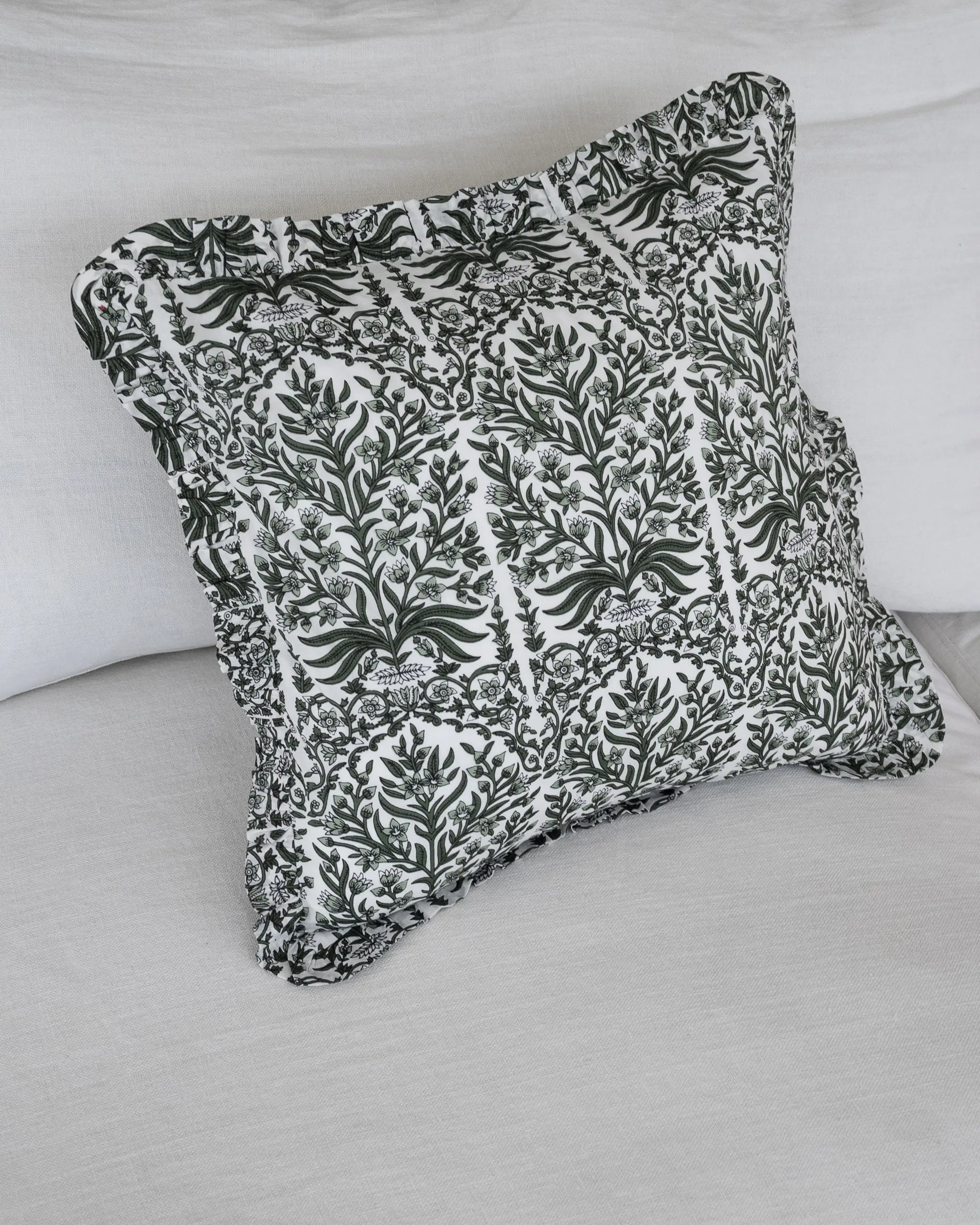 CARACTERÍSTICAS: Funda de cojín decorada con volantes. Disponible mantelería, neceseres y monederos con el mismo estampado.
