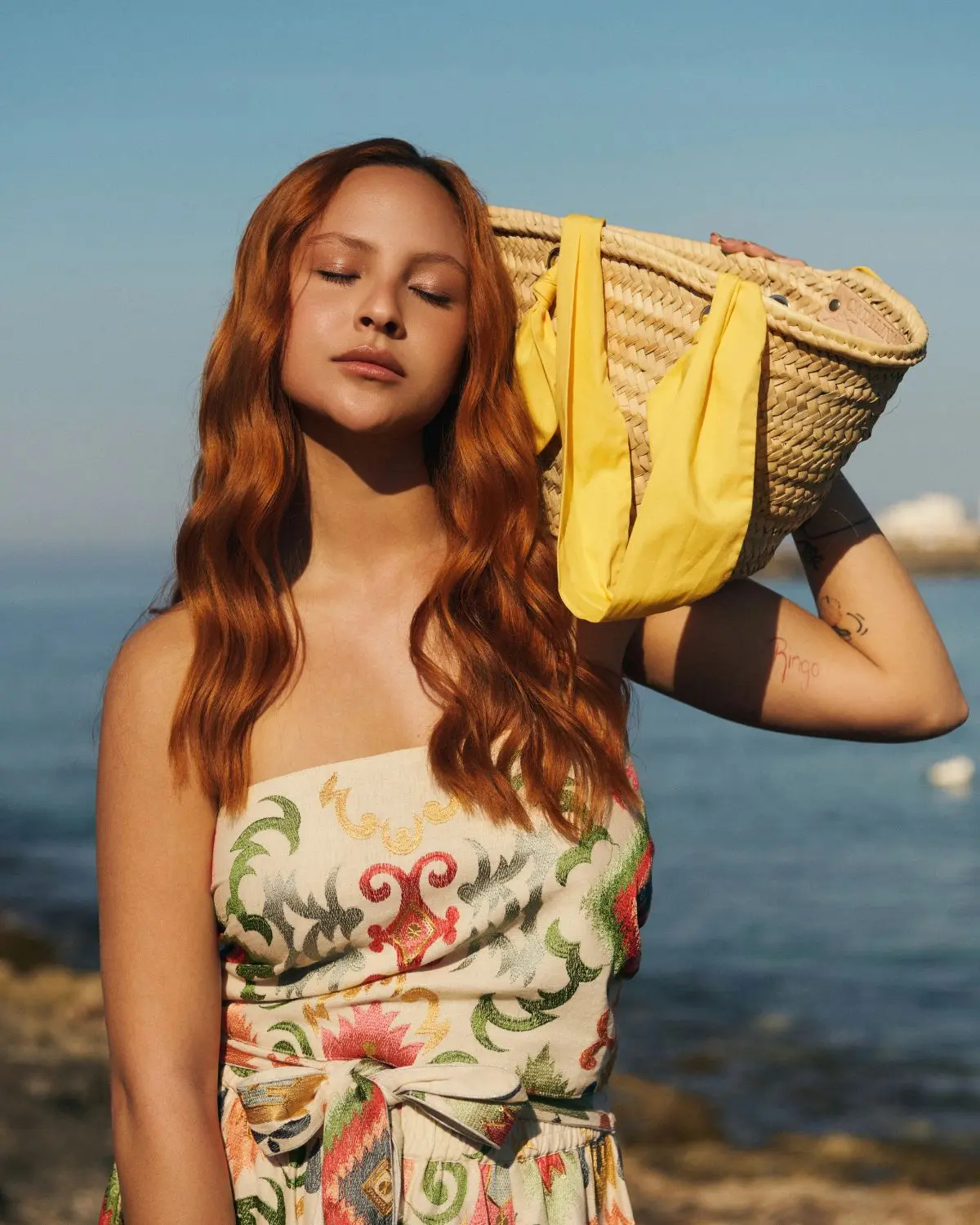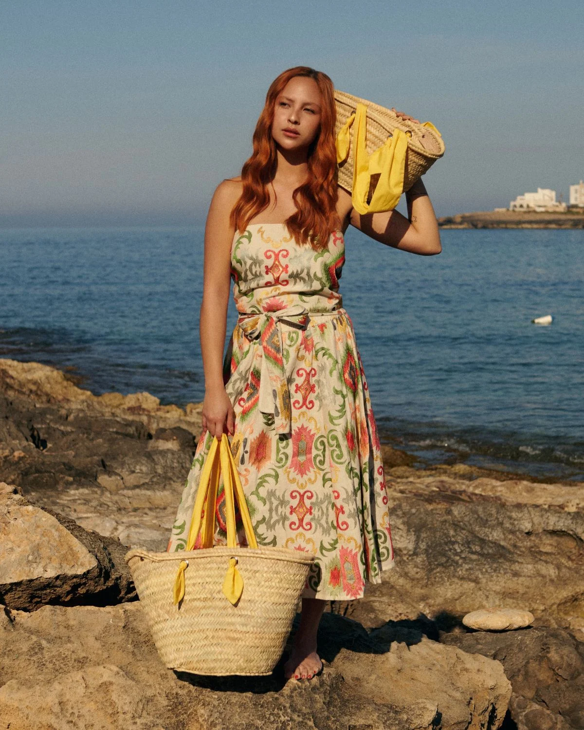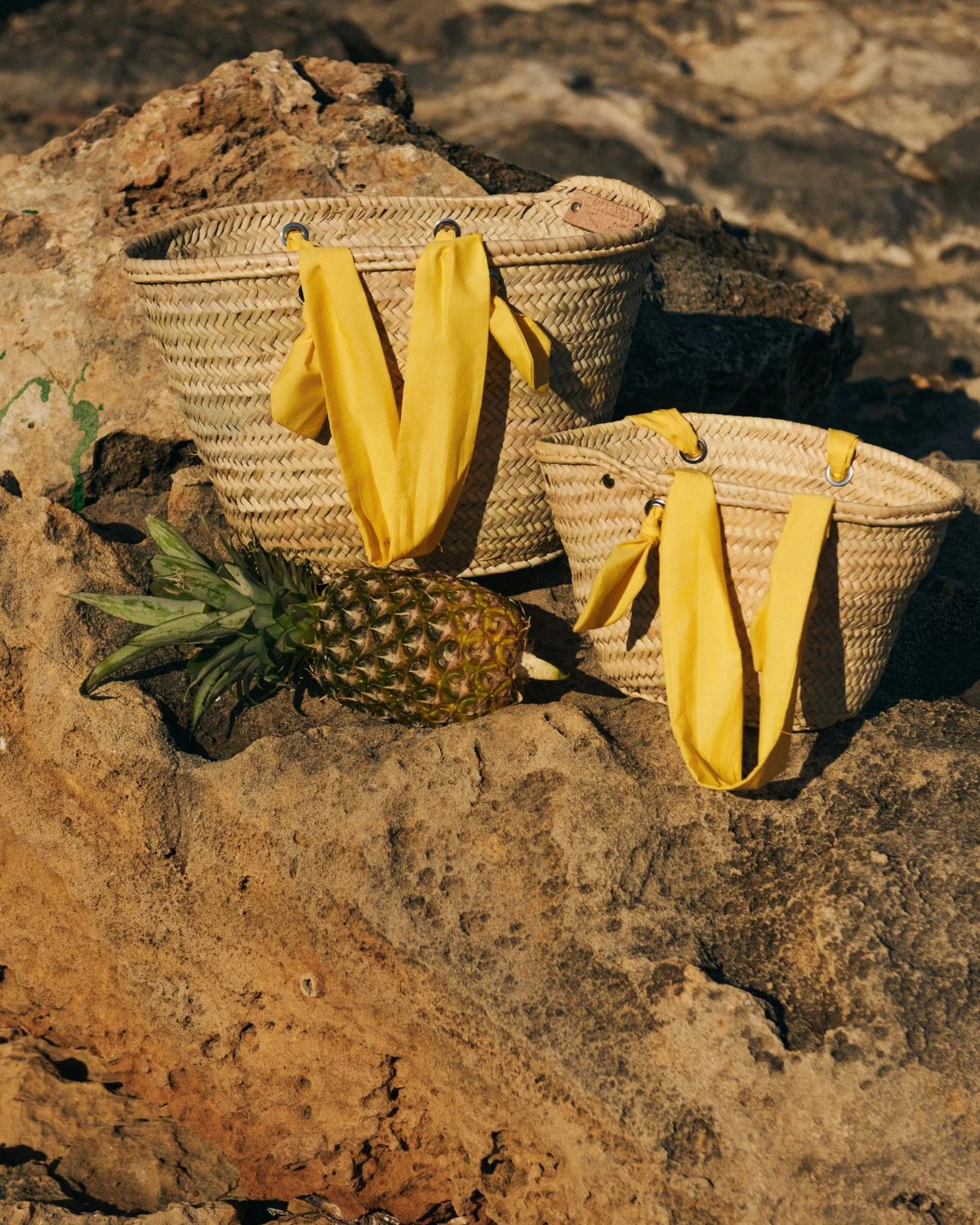 Las asas de algodón en color amarillo refuerzan la personalidad de la pieza, aportando un contraste vibrante que transmite frescura y naturalidad, convirtiendo esta cesta de palmito con acabado estilo rafia en un accesorio versátil ideal para acompañar atuendos veraniegos con elegancia relajada.