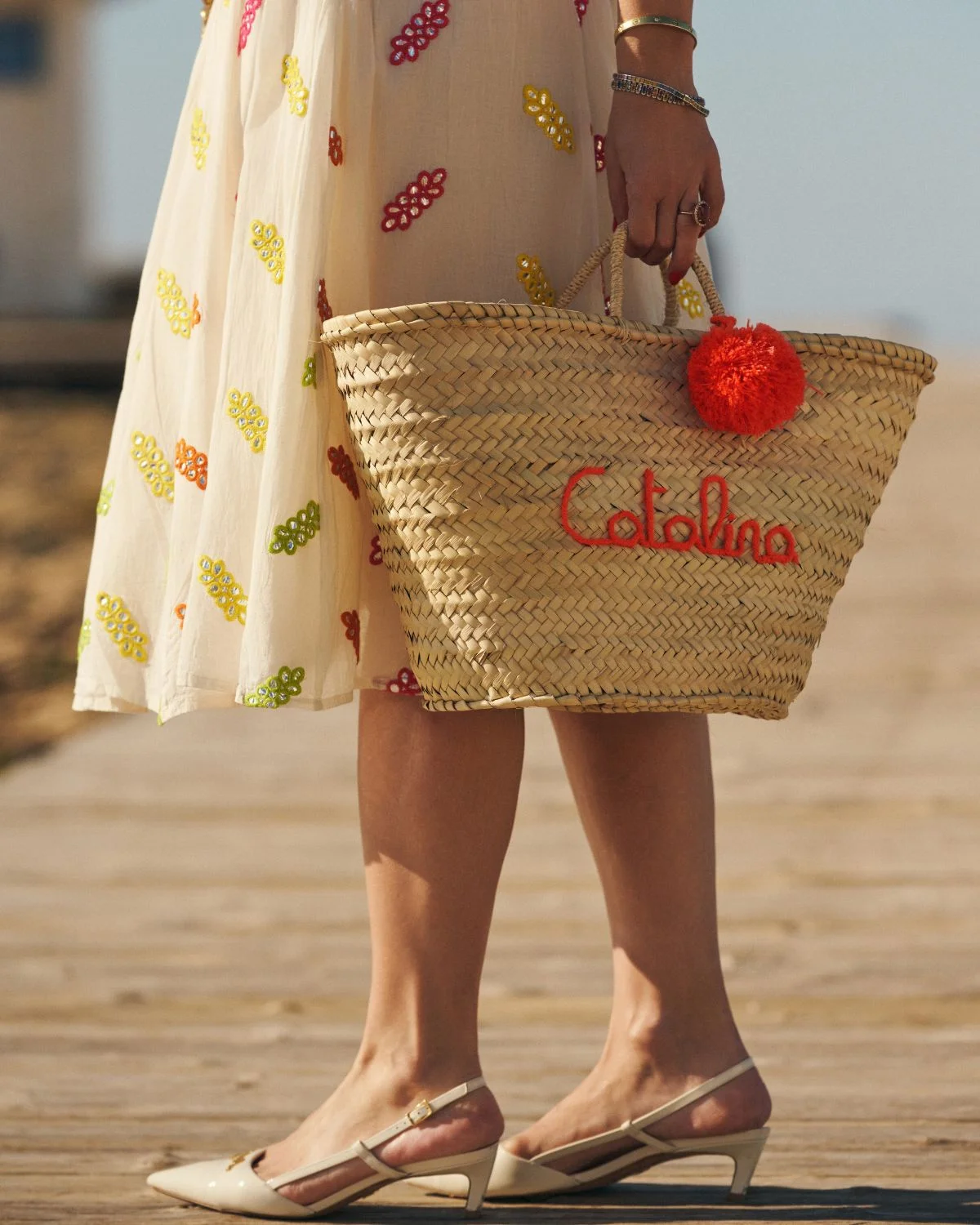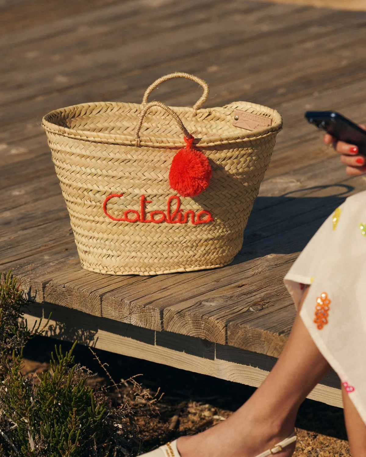 El bordado artesanal «Catalina» junto al pompón en tono naranja introduce un acento cálido que evoca la energía del verano mediterráneo, manteniendo la elegancia y naturalidad propias de los materiales artesanales.