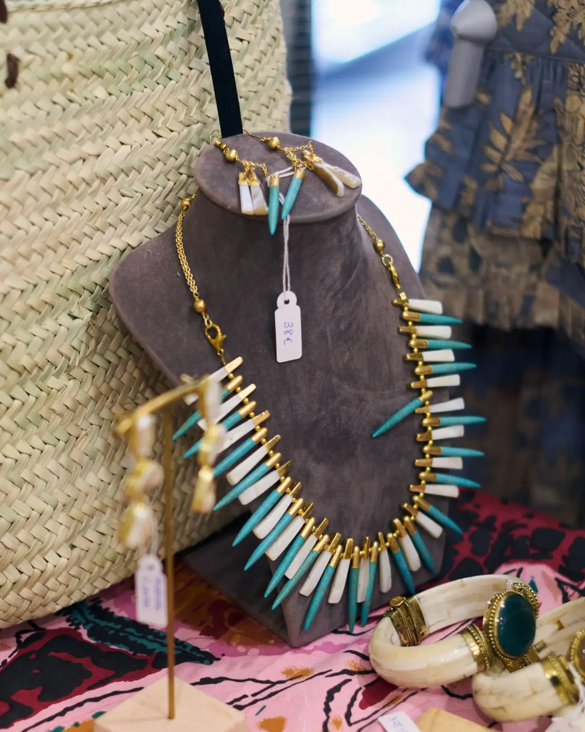 Este collar de mujer elaborado con baño de oro de 18K incorpora piezas de turquesa y nácar dispuestas en un diseño estructurado que aporta carácter y sofisticación. Su estética se inspira en la joyería artesanal india, donde cada detalle refleja exclusividad y autenticidad, convirtiéndose en un accesorio protagonista dentro de la colección.