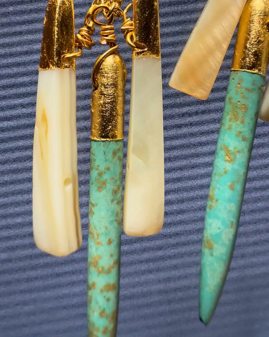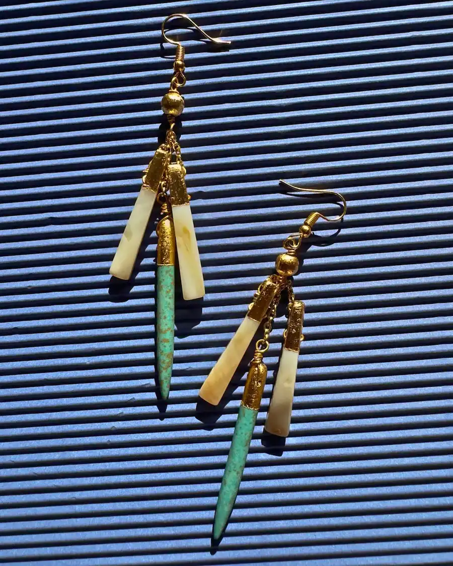 Su diseño vertical y alargado aporta movimiento y elegancia, convirtiéndolos en el complemento perfecto para looks bohemios, mediterráneos o sofisticados. La combinación del azul turquesa con el blanco nácar y el dorado crea un equilibrio de colores naturales que evoca el mar y el verano de Mallorca.