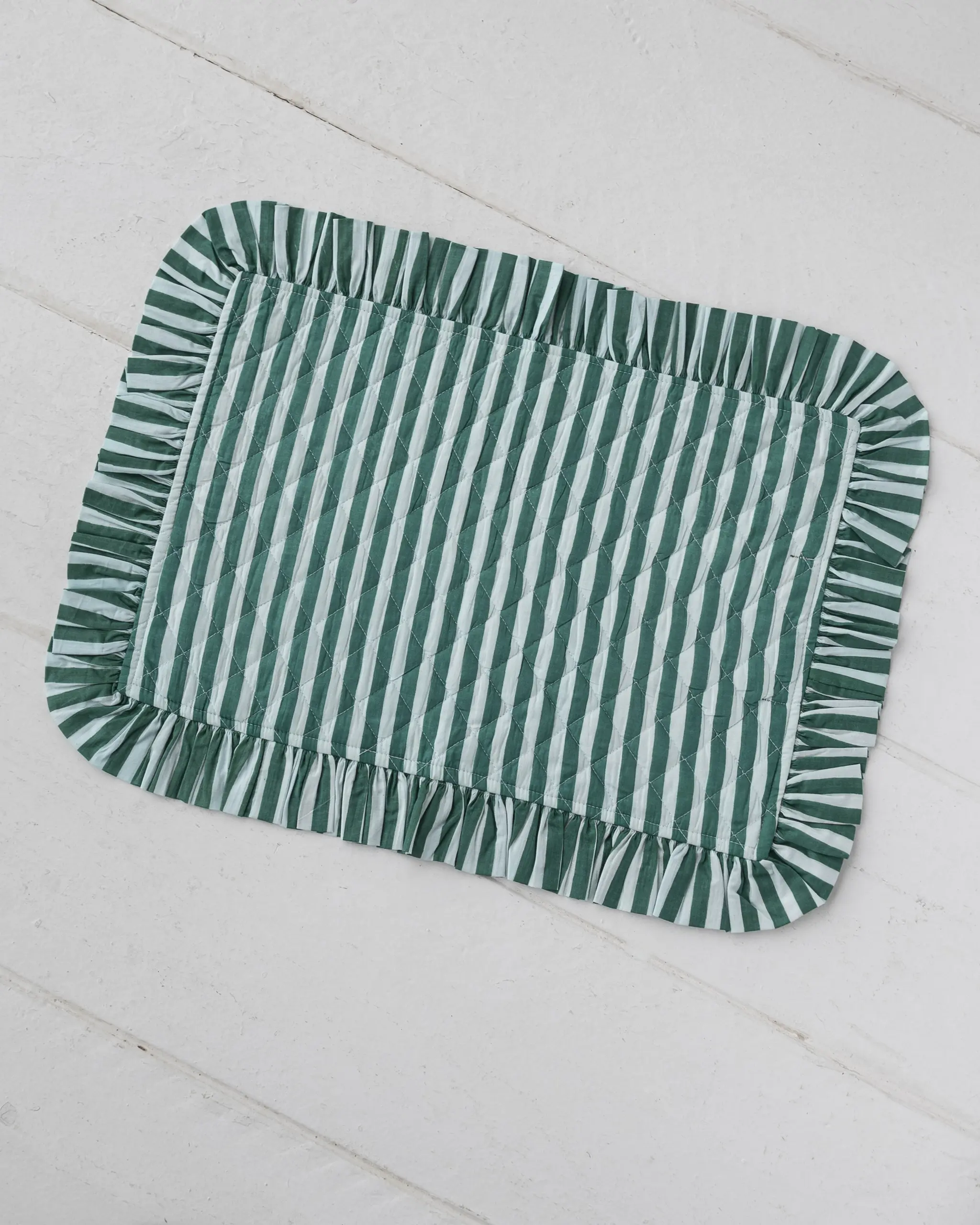 CARACTERÍSTICAS: Mantel individual acolchado de tejido estampado, decorado con volantes