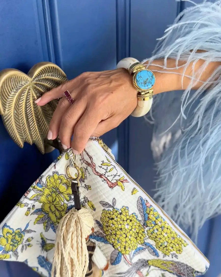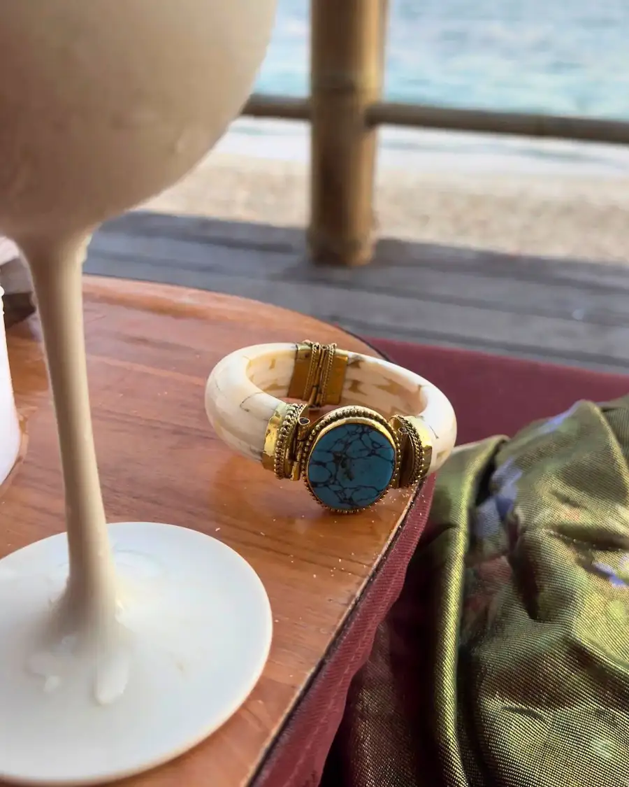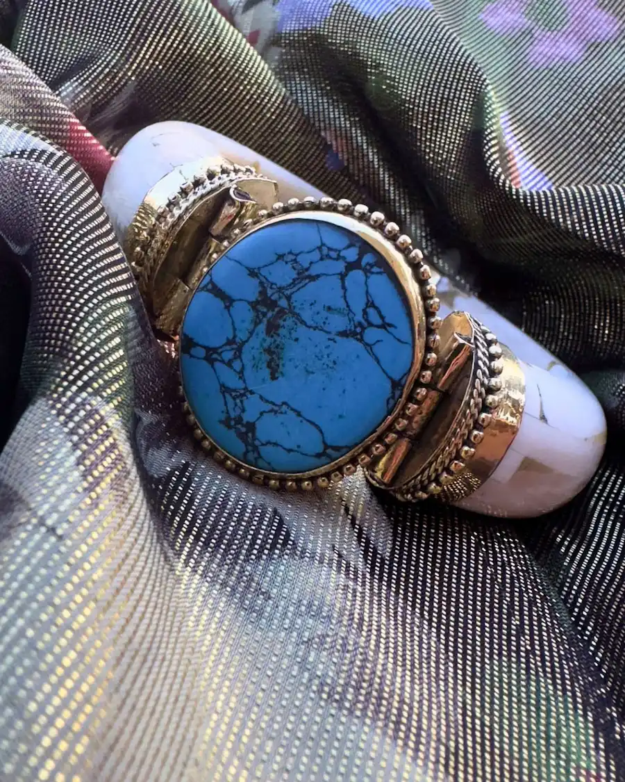 Este brazalete azul negro llega desde India, donde artesanos especializados trabajan cada pieza de forma completamente manual. No hay dos iguales. Cada uno tiene sus propias pequeñas variaciones en el engarce, en la distribución del color de la piedra, en los detalles del latón. Eso no es un defecto: es la firma de lo artesanal, la prueba de que detrás de cada brazalete hay un par de manos que lo crearon con dedicación.