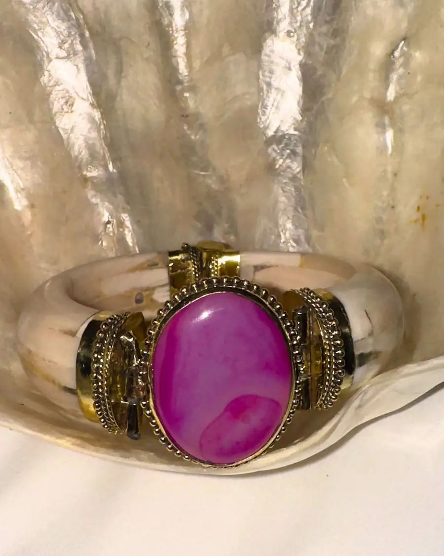 Este brazalete es ideal para quienes buscan una pieza que sea el centro de atención de su look sin necesidad de más accesorios. Solo con este brazalete magenta en la muñeca, cualquier conjunto gana personalidad y fuerza visual.