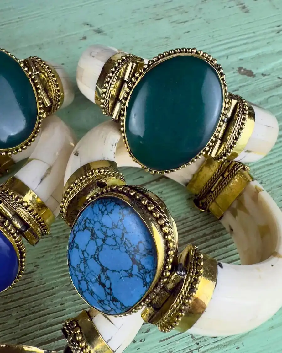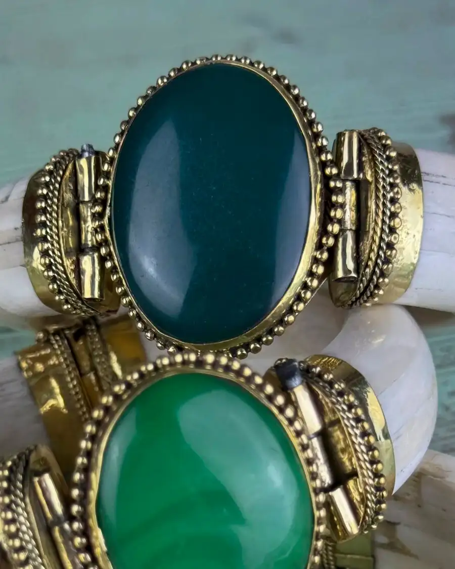 Este brazalete verde oscuro está inspirado en las tradiciones artesanales de India, donde los artesanos llevan generaciones perfeccionando el arte de crear joyería con materiales naturales y sintéticos de alta calidad. El resultado es una pulsera con aspecto antiguo, cargada de personalidad y perfecta para quienes buscan accesorios que cuenten una historia.